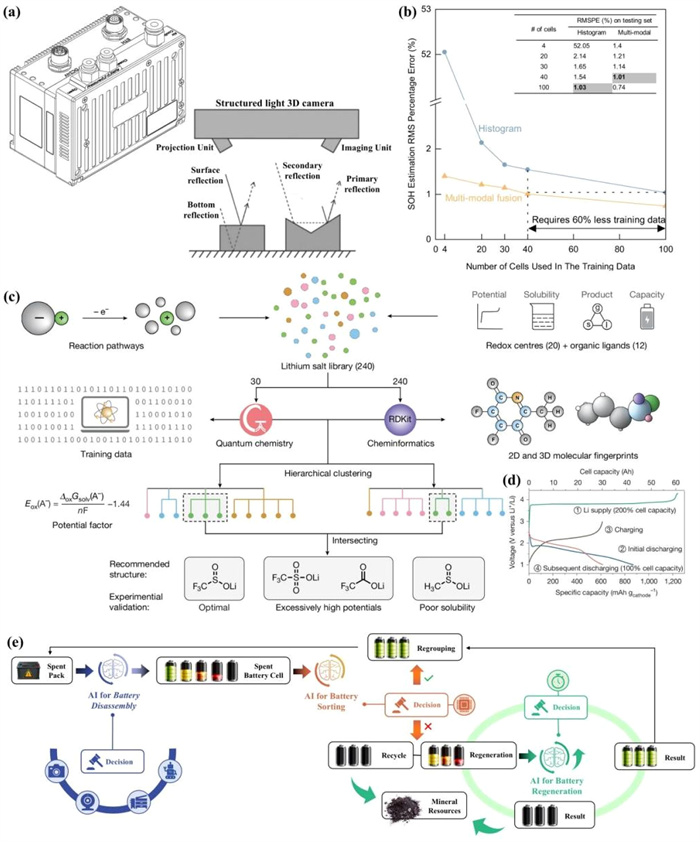 | Fig. 5. (a) The 3D camera invented by Mech-Mind [34,35]. (b) Multimodal fusion model achieving a 60% reduction in training data. Reproduced with permission [37]. Copyright 2025, Elsevier. (c) Core mechanism of machine learning for predicting lithium replenishment agents. Reproduced with permission [40]. Copyright 2025, Springer Nature. (d) Performance of batteries with restored energy storage capacity. Reproduced with permission [40]. Copyright 2025, Springer Nature. (e) AI-powered full-process recycling of spent power batteries. | |
