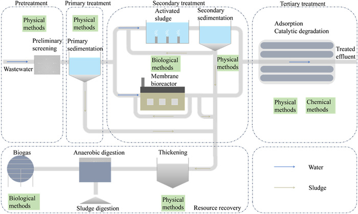 Industrial wastewater treatment technologies are generally categorized into physical, chemical, and biological methods. Physical methods are mainly used to separate suspended solids, colloids, and some dissolved substances. Chemical methods involve the transformation or removal of pollutants through chemical reactions. Biological methods utilize microbial metabolism to degrade organic matter, remove nitrogen, and phosphorus, forming the core of secondary treatment with relatively low costs. The current technological status of industrial wastewater treatment relies on refined, classified management and integrated processes combining multiple technologies (Fig. 6). Future trends will focus on further optimizing the efficiency and energy consumption of these technologies, moving toward resource recovery (water, energy, chemicals) and intelligent operation.