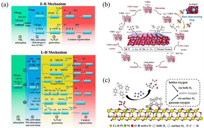 | Fig. 7. (a) Two widely accepted NH3-SCR mechanisms. Reproduced with permission [61]. Copyright 2022, American Chemical Society. (b) The possible toluene oxidation mechanism over La-doped CoMn2O4 catalysts. Reproduced with permission [62]. Copyright 2023, American Chemical Society. (c) Illustration of the participation pathway of oxygen species in the process of toluene oxidation on Pt/Ni-CeO2 catalyst. Reproduced with permission [63]. Copyright 2023, Elsevier. | |