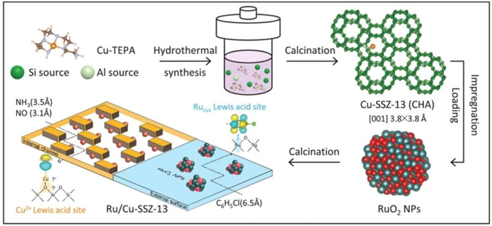 | Fig. 8. Illustration of synergistic catalytic elimination of NO and chlorobenzene over Ru/Cu‐SSZ‐13. Reproduced with permission [59]. Copyright 2020, Wiley. | |