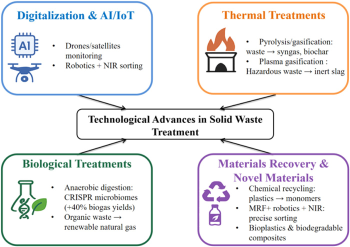 6.3. Advances in science and technology to meet challengesRecent innovations in solid waste treatment are crucial for overcoming these barriers, leveraging digitalization, biotechnology, and thermal processes to enhance efficiency and sustainability (Fig. 9). AI and the Internet of Things (IoT) are transforming waste management operations [70]. Machine learning models, which analyze data from drones and satellites, are being used to monitor illegal dumping, improving enforcement.