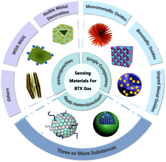 As discussed earlier, research on the detection of BTX gases is crucial for both the environment and human health. However, based on a literature survey, the number of comprehensive reviews on resistive MOS-based gas sensors for BTX gas detection is currently limited. This paper aims to provide a comprehensive review of the latest advancements in BTX gas sensors, categorizing gas-sensitive materials into three groups as shown in Fig. 1: Single-component gas-sensitive materials, one heterojunction gas-sensitive materials, and multiple heterojunctions gas-sensitive materials. Additionally, it will discuss how different sensing materials, morphologies, temperatures, and other parameters influence the sensitivity of gas sensors toward BTX gases.
