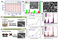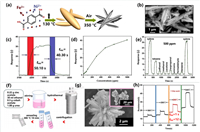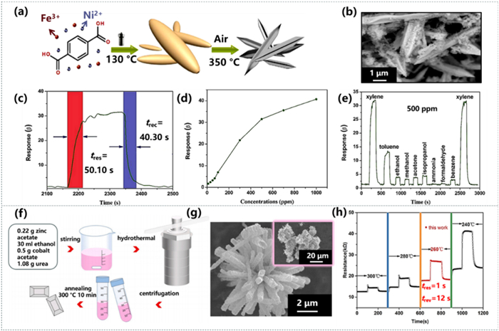 | Fig. 3. (a) Schematic illustration for the preparation of NiFe2O4 fusiformis. (b) SEM image of NiFe2O4 fusiformis. (c) Typical response and recovery time to 500 ppm xylene. (d) Relationship between the response values and xylene concentrations. (e) Selectivity of sensor based on NiFe2O4 fusiformis to 500 ppm of various gases at 300 ℃. (a-e) Reprinted with permission [62]. Copyright 2020, Springer Nature. (f) The schematic illustration of the ZnCo2O4 HPA synthesis. (g) The FESEM image of the ZnCo2O4 HPA. (h) Dynamic resistance variation. (f-h) Reprinted with permission [64]. Copyright 2022, Elsevier. | |