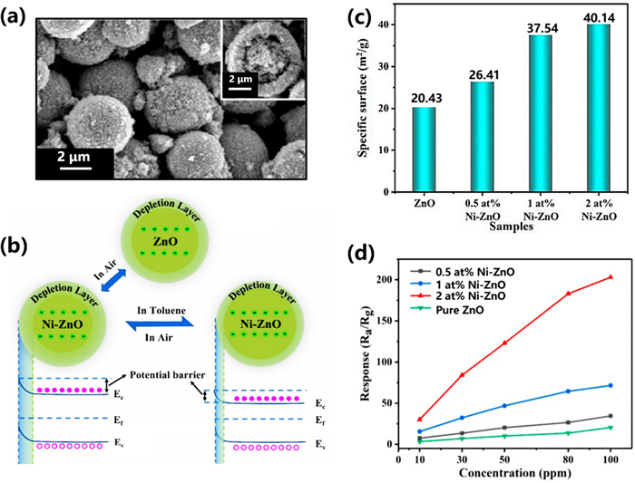 2.3. Doped metal oxidesDoping transition metal ions is an efficient tactic for metal oxides to improve their sensing performance. The doping of transition metal ions (e.g., Ti [66], Sn [54,67-70], Fe [71], Ni [52,72]) into the semiconductor lattice results in the lattice distortion of sensitive materials and thus generates a large number of defects and vacancies. The increase in the defect concentration on the surface can improve the adsorption of oxygen anions on the surface of the material, thereby improving the gas-sensing response value of the sensing material. Nowadays, many studies have been devoted to transition metal ion-doped metal oxides. Li et al. [52] displayed a Ni-doped ZnO with core-shell morphology (Fig. 4a). They used one-step solvothermal method and synthesized different ratios of 0, 0.5, 1, 2 at% Ni-doped ZnO. As shown in Fig. 4c, with the ratio of Ni increasing, the specific surface of the sensing material is raised. According to the sensing test results shown in Fig. 4d, the sensor based on 1 at% Ni-doped ZnO exhibited the best sensing performance towards toluene gas from 210 ppm to 100 ppm at 325 ℃, and it can detect the toluene as low as 500 ppb. The response and recovery time are 2 s and 77 s, respectively. Through the molecular level research, it is confirmed that the better sensing performance of 1 at% Ni-doped ZnO is contributed to the catalyst effect of Ni ions and the improvement in the specific surface area and relative percentage of oxygen vacancy after Ni doping. The sensing mechanism is shown in Fig. 4b.