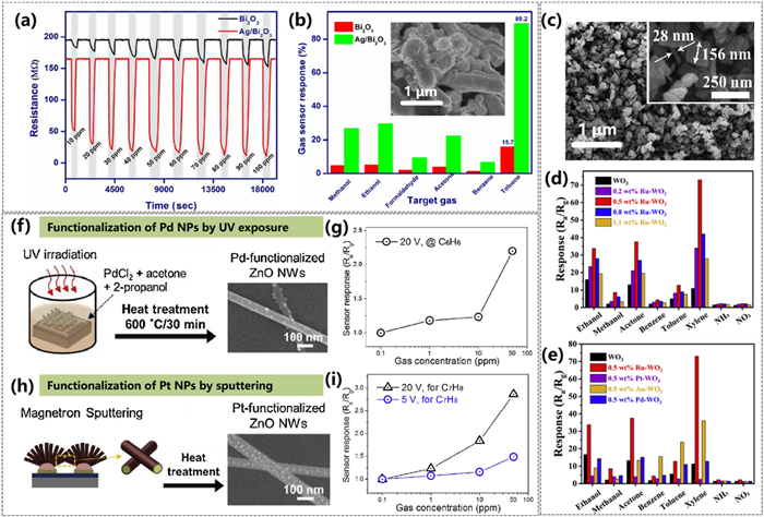 | Fig. 5. (a) Resistance of the gas sensor being alternatively exposed to air and toluene gas for both Bi2O3 and Ag/Bi2O3 at 10–100 ppm. (b) Gas sensor response of Bi2O3 and Ag/Bi2O3 against 50 ppm concentration of six different gases formaldehyde, acetone, methanol, ethanol, benzene and toluene at room temperature. (a, b) Reprinted with permission [100]. Copyright 2020, Elsevier. (c) SEM images of 0.5 wt% Ru-WO3. (d) The sensor response to 100 ppm ethanol, methanol, acetone, benzene, toluene, xylene, NH3 and 1 ppm NO2. (e) The response of sensors based on 0.5 wt% Ru, Pt, Pd and Au loaded WO3 to 100 ppm ethanol, methanol, acetone, benzene, toluene, xylene, NH3, and 1 ppm NO2. (c-e) Reprinted with permission [107]. Copyright 2020, Elsevier. (f) Illustration of Pd NPs synthesis procedure. (g) The corresponding response of Pd-ZnO NWs versus benzene concentration. (h) Illustration of Pt NPs synthesis procedure. (i) Responses of Pt-functionalized ZnO NWs derived from 5 nm Pt layer deposited on ZnO NWs to various concentrations (0.1–50 ppm) of toluene (C7H8) at 20 V and 5 V. (f-i) Reprinted with permission [99]. Copyright 2019, Elsevier. | |