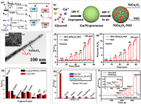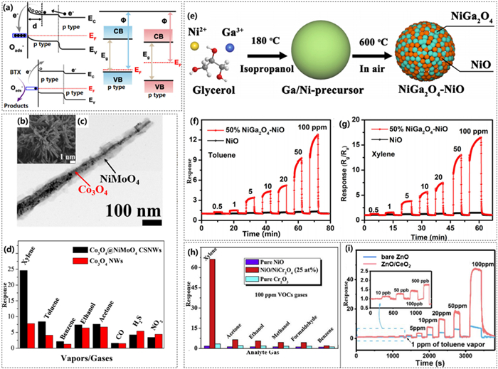 | Fig. 7. (a) Energy band structure of the MOS homogeneous heterojunction in vacuum, contact situation in air and BTX environment. (b, c) SEM and TEM images of Co3O4—NiMoO4 CSNWs. (d) Cross-responses of Co3O4 NWs and Co3O4—NiMoO4 CSNWs to various gases at 255 ℃. (a-d) Reprinted with permission [128]. Copyright 2019, Springer Nature. (e) Schematic illustration of the synthesis of NiGa2O4—NiO sample. (f, g) Dynamic sensing transients of 50% NiGa2O4—NiO and pristine NiO toward toluene and xylene in the concentration range of 0.5–100 ppm at 230 ℃. (e-g) Reprinted with permission [123]. Copyright 2019, Elsevier. (h) Selectivity of the NiO, NiO/NiCr2O4 (Cr/Ni = 25 at%) and Cr2O3 samples. Reprinted with permission [132]. Copyright 2019, Elsevier. (i) Response curves of the ZnO–CeO2 and bare ZnO for toluene vapors with concentrations in the range of 10 ppb to 100 ppm. Reprinted with permission [117]. Copyright 2020, Royal Society of Chemistry. | |