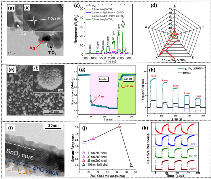 | Fig. 9. (a, b) The TEM images of Ag-Cu/TiO2 NPs. (c) The real-time response curve of the Ag-Cu/TiO2 towards xylene. (d) Radar selectivity plot. Letter A corresponds to acetone, while the others are BTEX in a radar plot. (a-d) Reprinted with permission [167]. Copyright 2022, Royal Society of Chemistry. (e, f) FESEM images of Ag0.4Pd0.6–In2O3. Reprinted with permission [132]. Copyright 2022, Elsevier. (g) Dynamic response and recovery time curve of Ag0.4Pd0.6–In2O3. (h) The representative dynamic sensing curves of Ag0.4Pd0.6@In2O3 and pristine In2O3 to toluene in the low concentration range (1–5 ppm) at 180 ℃. (g, h) Reprinted with permission [168]. Copyright 2022, Elsevier. (i) Low magnification TEM micrograph of a Pt NP-functionalized SnO2–ZnO CSNWs. (j) Variation of response to toluene gas with varying the thickness of ZnO shell layer. (k) Dynamic resistance curves of Pt-functionalized SnO2–ZnO CSNWs with a ZnO shell thickness 85 nm. (i-k) Reprinted with permission [170]. Copyright 2017, Elsevier. | |
