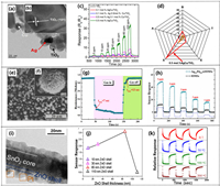 In another study related to spinel structured semiconductor metal oxides, Li et al. [64] reported a p-type hollow porous tube assembled ZnCo2O4 hierarchical porous architectures (HPA) synthesized by a solvothermal method and annealing treatment. The schematic illustration of the ZnCo2O4 HPA synthesis is presented in Fig. 3f, and the FESEM is shown in Fig. 3g. According to nitrogen adsorption-desorption measurement, the ZnCo2O4 HPA has a huge surface area of 35.6 m2/g. Moreover, the ZnCo2O4 HPA-based gas sensor exhibits good response to xylene at the optimum operating temperature of 260 ℃ and show a rapid response time and recovery time of 1 s and 12 s, respectively (Fig. 3h). This is due to appropriate activity and distinctive hierarchical porous structures of the ZnCo2O4 HPA, which can not only promote the oxidation of xylene and improve surface chemical reaction, but also make for the gas adsorption and desorption.