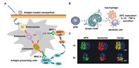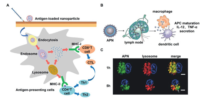 | Fig. 2. Antigen presentation process of adjuvants. (A) Essential uptake pathways of antigens (e.g., endocytosis and phagocytosis) by APCs induce immune responses. (B) Schematic of how APN—CpG activates DCs and macrophages in LNs. C57BL/6 mice were injected in the footpad with 25 µL of the indicated formulations, and popliteal LNs were isolated for analysis at the indicated time points. (C) Representative confocal laser scanning images showing BMDCs cultured for different periods with FITC-APN (green); lysosomes were stained with LysoTracker Red (red). Nonoverlapping green and red signals indicate lysosomal escape of APN (white arrow). Scale bar: 5 µm. Reproduced with permission [48]. Copyright 2017, John Wiley and Sons. | |