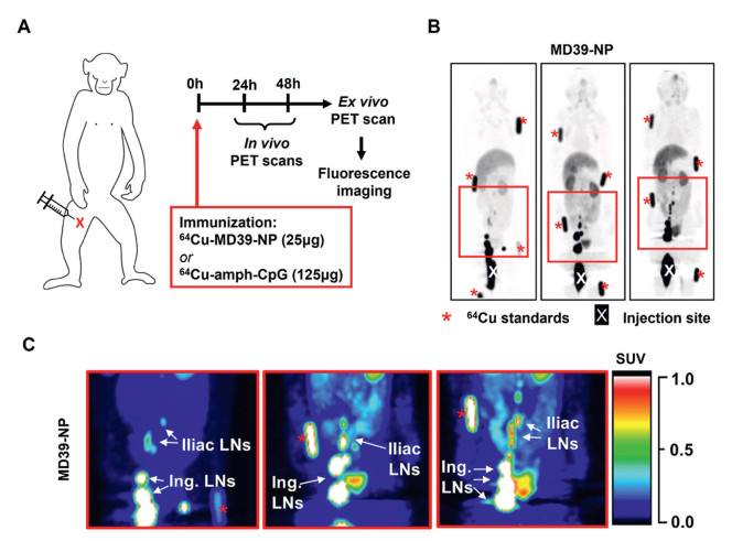 | Fig. 3. Imaging to track the migration of adjuvants. (A) Immunization timeline for PET and MR imaging studies. (B) Maximum intensity projections (MIPs) of representative in vivo PET scans at 24 h showing the 64Cu-DOTA-MD39-NP signal. "X" denotes the injection site, and red asterisks indicate fiducial markers. (C) Pseudocolor images of the boxed areas are shown in (B), highlighting drainage to the iliac and inguinal LNs. Copied with permission [40]. Copyright 2021, Elsevier. | |
