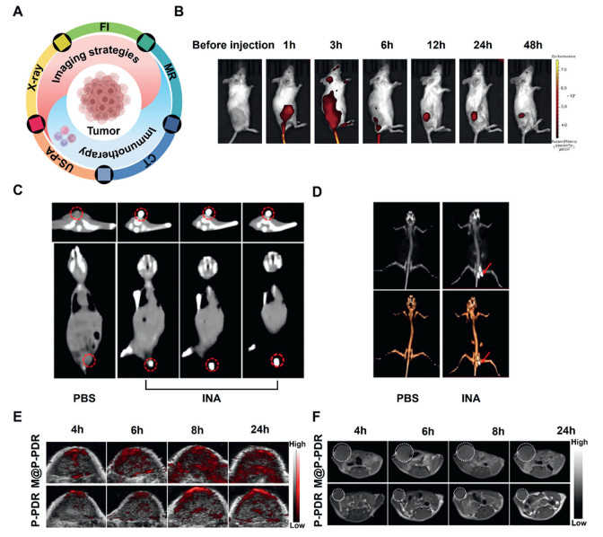 | Fig. 4. Different imaging techniques monitor the adjuvant-induced recruitment of immune cells. (A) Relationships of different imaging strategies with adjuvant-generated immunotherapy. (B) Time series of the tumor NIR FI in situ. Reproduced with permission [62]. Copyright 2021, Elsevier. (C) Axial and coronal CT images of 4T1 tumor-bearing mice after intratumoral injection of PBS or INA. The red circles indicate the locations of the tumors. (D) 3D reconstruction images from CT images of 4T1 tumor-bearing mice after intratumoral injection of PBS or INA. Red arrows indicate the location of the tumors. (C, D) Reproduced with permission [29]. Copyright 2022, Frontiers. (E) In vivo PA images of tumors. (F) T1-weighted MR images of tumors. (E, F) Reproduced with permission [65]. Copyright 2021, Springer Nature. | |
