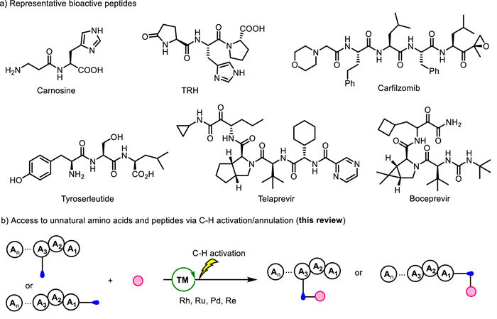 Natural peptides are usually not be used as direct therapeutics due to their intrinsic weaknesses, such as poor physical and chemical stability, and a short circulating plasma half-life. Unnatural peptides are often essential for academic and industry circles, because of the enhanced pharmacokinetics and bioactivity in contrast with the natural ones. Thus, concise and efficient accesses to unnatural amino acids and peptides have been investigated. Among them, chemo- and site-selective methods are the key points in modern chemistry, due to the capacity to fine-tune structural characters that can help modulate biological and physicochemical properties. Compared to classical condensations and (cyclo)additions as well as transition metal-catalyzed cross-coupling reactions, transition metal-catalyzed C—H activation shows great advantages in the modifications of amino acids and peptides. Without substrate prefunctionalizations, diverse transformations can be performed in a high atom- and step-economical fashion. Recently, transition metal-catalyzed C—H activation/annulation has been employed in the late-stage derivatizations of amino acids and peptides. For Rh-catalyzed C—H activation/annulation, by using amide as directing group, an array of structurally novel amino acids and peptides with different kinds of heterocycles is achieved, such as bearing quinolone, isoquinolone, benzazepine, indolizinone, quinolizinone, pyrimido[1,6-a]indolone and polycyclic aromatic hydrocarbon oxonium ion scaffolds. Employing N-phenoxy amide or phosphinamide as directing group gives amino acids bearing a dihydrobenzo[d]isoxazole or a phosphaisoquinolin-1-one moiety, respectively. Utilizing phenol as directing group affords amino acids and peptides bearing a chromone core. For other transition metal-catalyzed C—H activation/annulation, such as Ru, Pd and Re, by using amide or sulfonamide as directing group, amino acids and peptides bearing isoquinolone or benzosultam scaffolds are respectively generated. Employing imine as directing group produces amino acids bearing an indane moiety.