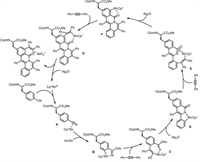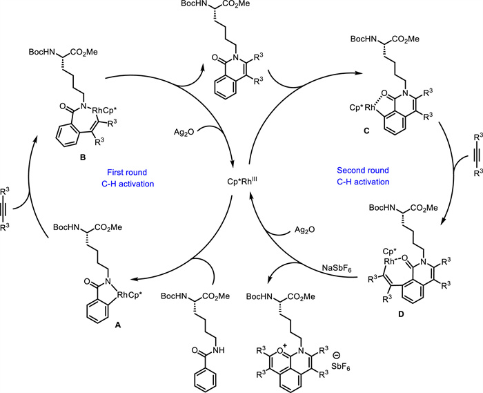 Later on, they used Ag2O as oxidant, AgSbF6 and NaSbF6 as additives, and DCE as solvent, leading to double C—H activation products. This Rh(Ⅲ)-catalyzed double C—H activation/annulation reaction was successfully employed in the synthesis of fluorescent amino acids and peptides 23 (Scheme 9) [56]. Through the coupling of Lys-based amino acids or peptides 22 with alkynes 15, the fluorescent tricyclic-fused aromatic hydrocarbon oxonium ions 23 were in situ generated. The robustness of this protocol was reflected by broad substrate scope, high atom- and step-economy, as well as high chemo- and site-selectivity. Notably, unsymmetrical double C—H activation/annulation using two different alkynes could be achieved via sequential two steps, producing novel fluorescent amino acids and peptides. The obtained fluorescent oxonium ions owned tunable fluorescence emission and low cytotoxicity, and could specifically target lysosomes of living cells. As proposed (Scheme 10), a five-membered rhodacycle intermediate A is formed via Rh(Ⅲ)-catalyzed C—H activation. Following alkyne insertion and subsequent reductive elimination, the mono C—H activation product is formed along with a Rh(Ⅰ) complex, which is then oxidized by Ag₂O to regenerate the active Rh(Ⅲ) species. Second Rh(Ⅲ)-catalyzed C—H activation affords intermediate C, followed by alkyne insertion and reductive elimination delivering the final product and Rh(Ⅰ) species, which is oxidized by Ag2O to regenerate the Rh(Ⅲ) catalyst.
