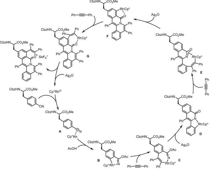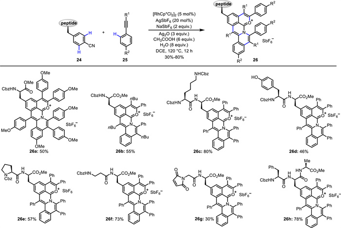 Very recently, Song and Cai disclosed a Rh(Ⅲ)-catalyzed triple C—H activation/annulation for peptide modification (Scheme 11) [57]. An array of fluorescent peptides 26 was synthesized from Phe-based peptides 24 and alkynes 25 via in situ formation of polycyclic aromatic hydrocarbon oxonium ions. Mechanistic experiments indicated that the triple C—H activation/annulation is successive rather than step-by-step. This method exhibited broad substrate scope, high atom- and step-economy, and excellent chemo- and site-selectivity. The fluorescent peptides showed maximum emission wavelength up to 628 nm and low cell cytotoxicity. A dipeptide bearing maleimide residue was tolerated to give the corresponding fluorescent product 26g, which could be employed in bioconjugation with protein BSA. Notably, fluorescent amino acids and peptides could specifically target lysosomes and mitochondria of live mammalian cells. According to the mechanism (Scheme 12), intermediate A is initially formed via the coordination of the Rh(Ⅲ) center with the CN group. Nucleophilic attack of AcOH to A and rapid Rh(Ⅲ)-catalyzed C—H activation prior to the dissociation of Rh(Ⅲ) species, give five-membered rhodacycle B. Subsequent alkyne insertion affords seven-membered rhodacycle C. Reductive elimination of C generates Rh(Ⅰ)-N species, which undergoes rapid oxidization to form Rh(Ⅲ)-N intermediate prior to the dissociation of Rh(Ⅰ) species, followed by Rh(Ⅲ)-catalyzed C—H activation forming five-membered rhodacycle D. The second alkyne insertion yields intermediate E, which involves coordination between the Rh(Ⅲ) center and the oxygen atom. Subsequent reductive elimination produces a Rh(Ⅰ) complex that coordinates with the carbonyl group. This suffers from rapid oxidization affording a Rh(Ⅲ) intermediate prior to dissociation of the Rh(Ⅰ) species, followed by Rh(Ⅲ)-catalyzed C—H activation generating a five-membered rhodacycle F. The third alkyne insertion and reductive elimination deliver the final product and Rh(Ⅰ) intermediate, which is oxidized by Ag2O to regenerate the Rh(Ⅲ) species.