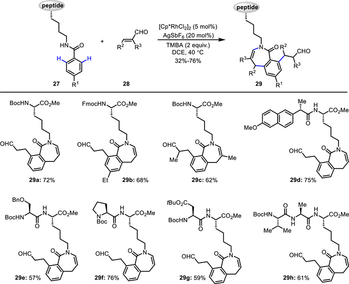 Based on their previous works [55,56], Song, Cai and Van der Eycken reported an efficient method for synthesizing peptide-benzazepine conjugates 29 from Lys-based peptides 27 and acroleins 28 (Scheme 13) [58]. This Rh(Ⅲ)-catalyzed double C—H activation was performed under mild reaction conditions, featuring broad scope, high atom- and step-economy as well as excellent chemo- and site-selectivity. α-Me- (29c), Et- or Bn-substituted acroleins worked well to afford double C—H activation products in good yield, while α-acroleins bearing a long aliphatic chain gave a mixture of mono and double C—H activation products. 2-Phenylacrolein was not compatible with the standard conditions, probably because of the much easier polymerization. β-Me-substituted acrolein reacted smoothly to afford a mixture of mono and double C—H activation products, while a β-Et-substituted acrolein only delivered the mono C—H activation product. Both trans-cinnamaldehyde and vinyl ketone were not compatible, probably because of the poor reactivity. The synthetic practicality of this method was further demonstrated by scale-up experiments and product transformations including various late-stage aldehyde-based ligations. The preliminary bioactivity experiments displayed that peptide-benzazepine conjugates possess good antifungal activities toward crop and forest pathogenic fungi. As proposed (Scheme 14), initially, a five-membered rhodacycle A is formed via Rh(Ⅲ)-catalyzed C—H activation. Subsequent coordination of the Rh(Ⅲ) center with the alkene affords intermediate B, followed by alkene insertion forming a seven-membered rhodacycle C. Protonation of C generates intermediate D, which undegoes intramolecular cyclization and dehydration to produce the mono C—H activation product and regenerate Rh(Ⅲ) species. Next, a five-membered rhodacycle E is formed via Rh(Ⅲ)-catalyzed C—H activation. The coordination of E with a second alkene generates intermediate F, followed by alkene insertion and protonation delivering the final product and regenerating the Rh(Ⅲ) catalyst.