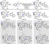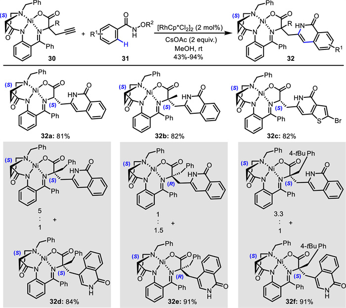 In addition to the design and modification of C—H activation partners, the adjustment of alkynes is also carried out. For example, Larionov and Loginov disclosed an asymmetric synthesis of artificial amino acids 32 bearing an isoquinolone skeleton (Scheme 15) [59]. Through Rh(Ⅲ)-catalyzed C—H activation/annulation of aryl hydroxamates 31 with diverse chiral propargylglycine Ni(Ⅱ) complexes 30 derived from Gly, Ala and Phe, a series of Ni(Ⅱ) complexes 32 comprising an isoquinolone moiety was efficiently synthesized in methanol at room temperature. Notably, for Phe-derived chiral propargylglycine Ni(Ⅱ) complexes (32d-32f), the simultaneous formation of 3- and 4-substituted isoquinolone regioisomers was observed. Moreover, the obtained Ni(Ⅱ) complexes could undergo decomposition using 6 mol/L HCl, offering the corresponding unnatural α-substituted and α,α-disubstituted amino acids having an isoquinolone scaffold in an enantiopure form.