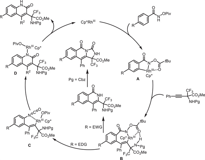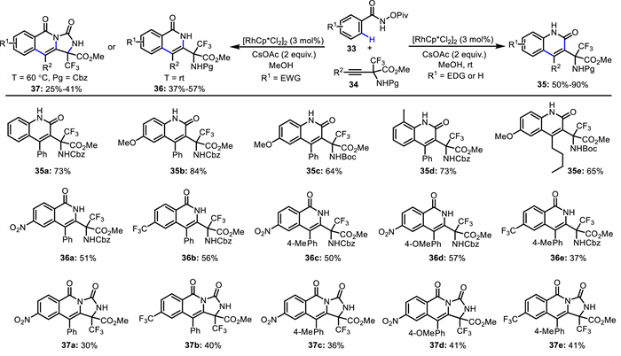 In 2021, Osipov and co-workers developed a convenient method for the synthesis of quinolone-containing amino acid derivatives (Scheme 16) [60]. By using internal alkynes 34 bearing an CF3-containing α-amino acid moiety, N-pivaloyloxy-arylamides 33 with an electron-donating group (EDG) underwent a Rh(Ⅲ)-catalyzed C—H activation and subsequent Lossen rearrangement/annulation process, resulting in 2-quinolone-containing α-CF3-amino carboxylates 35. When N-pivaloyloxy-arylamides 33 with an electron-withdrawing group (EWG) were used, isoquinolone-containing α-CF3-amino carboxylates 36 were obtained. When protecting group (Pg) = Cbz and the reaction temperature was increased from room temperature to 60 ℃, α-CF3-amino carboxylates 37 bearing a tricyclic core were prepared. As proposed (Scheme 17), Rh(Ⅲ)-catalyzed ortho-C-H bond activation of the N-pivaloyloxy amide generates rhodacycle A. Subsequent alkyne insertion proceeds in a regioselective manner, facilitated by intramolecular hydrogen bonding, to afford intermediate B. When R = EDG, Lossen rearrangement occurs to generate intermediate C. Intramolecular addition and protonation deliver the rearranged product and release the active Rh(Ⅲ) catalyst. When R = EWG, sequential reductive elimination, oxidative addition into the N—O bond and protonation give the isoquinolone product. When Pg = Cbz, further intramolecular cyclization occurs to afford tricyclic product.