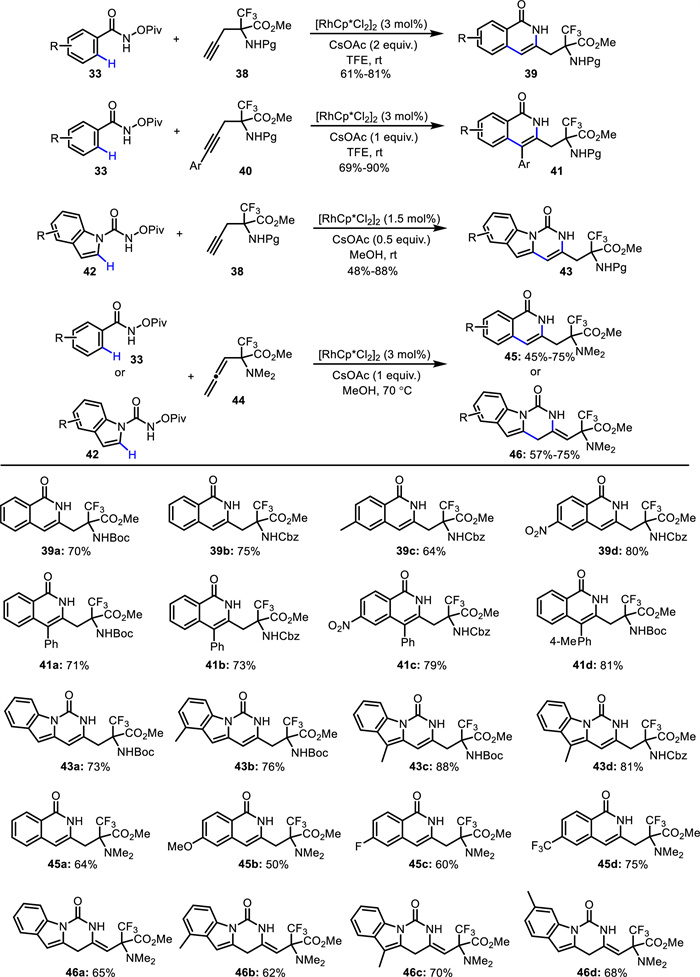 Subsequently, they synthesized a series of new terminal and internal α-amino acid-containing alkynes (38 and 40) bearing one more carbon, and employed them in [4 + 2] cycloaddition reactions (Scheme 18) [61-63]. Through Rh(Ⅲ)-catalyzed C—H activation of N-pivaloyloxy-arylamides 33 or N-(pivaloyloxy)-indole-1-carboxamides 42, diverse CF3-substituted amino acid derivatives bearing an isoquinolone (39 and 41) or pyrimido[1,6-a]indolone (43) core were efficiently constructed with excellent regioselectivity. Besides alkyne-tethered amino acids, allenyl-containing α-amino carboxylates 44 were also tolerated, resulting in an array of unnatural α-amino acids (45 and 46) [64].