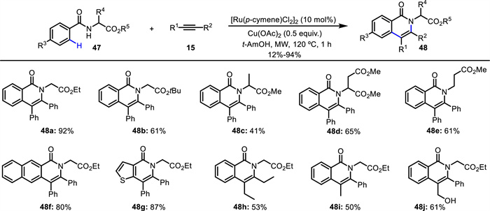 In 2018, Sharma and Van der Eycken reported a Ru(Ⅱ)-catalyzed C—H activation/annulation using an α-amino acid ester (47) as a directing group (Scheme 19) [65]. Under microwave irradiation, a wide range of unnatural amino acids 48 bearing an isoquinolone moiety were efficiently synthesized in 1 h. Diverse symmetrical diaryl- and dialkyl-substituted alkynes as well as unsymmetrical disubstituted alkynes (15) were well tolerated in this reaction. This method was successfully applied to the synthesis of an oxyavicine derivative.