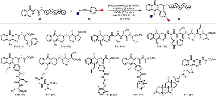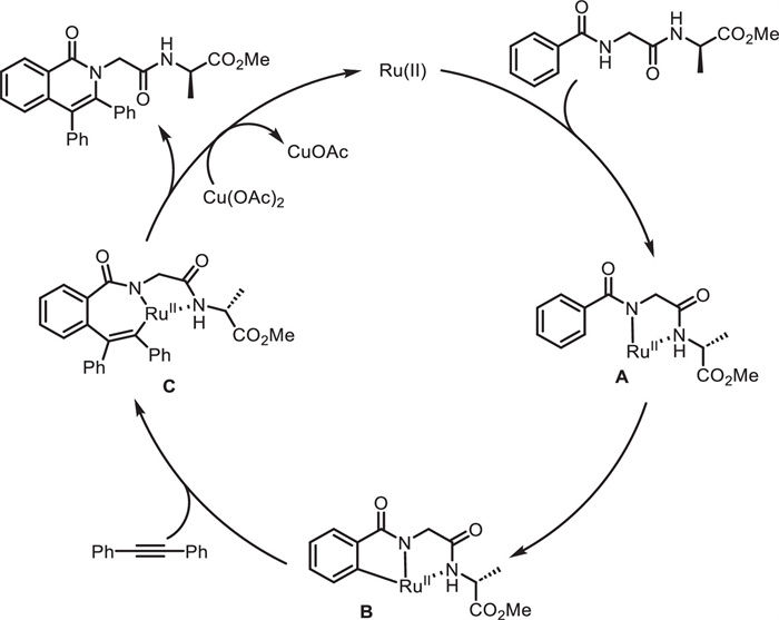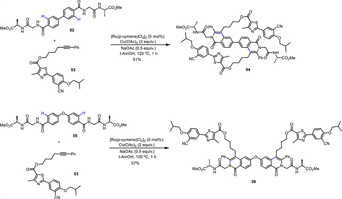 Subsequently, the same group developed an efficient and chemoselective method for the modification of peptide backbone [66]. Through a Ru(Ⅱ)-catalyzed C—H activation/annulation sequence, diverse functionalized isoquinolone scaffolds 51 were constructed in a rapid and step-economical manner (Scheme 20). Under racemization-free conditions, this method was employed in the synthesis of peptide conjugated to drugs (51g and 51h), natural products (51i) and other peptide (51e and 51f) fragments with excellent chemo- and regioselectivity. This reaction gave access to the preparation of novel peptide-pharmacophore conjugates. Notably, a double C—H activation/annulation process was successfully achieved to give biaryl and biaryl-ether dimeric peptide conjugates (54 and 56) (Scheme 21), generating molecular complexity in a short sequence. Moreover, the obtained unnatural peptides showed good fluorescence properties with maximum emission wavelength up to 479 nm. Importantly, mechanistic experiments indicated that amide bonds of the peptide backbone serve as the bidentate directing group to enable Ru(Ⅱ)-catalyzed C—H activation. As proposed (Scheme 22), Ru(Ⅱ) catalyst firstly coordinates with the NH-deprotonated peptide, leading to a five-membered intermediate A. Subsequent C—H bond cleavage gives the tridentate coordinated intermediate B. Squential alkyne insertion and reductive elimination deliver the final product and Ru(0), which is reoxidized by Cu(OAc)2 to regenerate the Ru(Ⅱ) species, closing the catalytic cycle.
