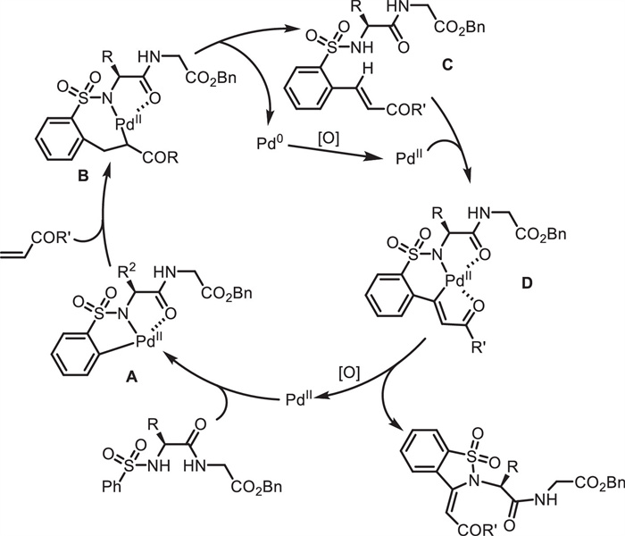 On the other hand, Wang and co-workers described a peptide-guided method for the functionalization of peptidosulfonamides 63 via Pd(Ⅱ)-catalyzed C—H activation (Scheme 24) [68]. In this approach, the peptide backbone served as an internal directing group and facilitated site-selective C—H activation/annulation of benzosulfonamides 63, efficiently leading to benzosultam-peptidomimetics 65. According to the mechanism (Scheme 25), Pd(Ⅱ)-catalyzed ortho-C-H bond activation directed by the N-sulfonated peptide occurs, giving a tridentate coordinated intermediate A. Subsequent alkene insertion and β-H elimination afford olefination intermediate C and the Pd(0) complex, which is reoxidized to regenerate the Pd(Ⅱ) species. Second Pd(Ⅱ)-catalyzed C—H activation at the newly generated olefin produces Pd-centered ternary fused-ring intermediate D. Reductive elimination of D delivers the final cyclic product and the Pd(0) complex, which is reoxidized to regenerate the Pd(Ⅱ) species for the next cycle.