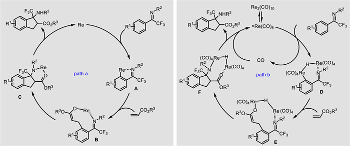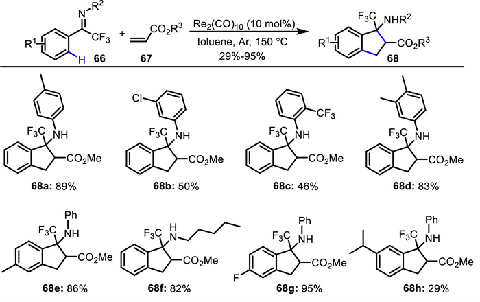 Besides the synthesis of unnatural α-amino acids, the strategies concerning constructing unnatural β-amino acids have also been explored. In 2020, Zhang and Xiong presented a [3 + 2] annulation of trifluoromethylated ketimines 66 with acrylates 67, leading to a series of β-CF3 β-amino esters 68 with an indane backbone (Scheme 26) [69]. This rhenium-catalyzed C—H activation showed broad substrate scope and a gram scale synthesis was elaborated. According to the experimental results, two plausible catalytic cycles were proposed (Scheme 27). On the one hand (path a), rhenium-catalyzed C—H activation occurs to give a five-membered intermediate A. Subsequent alkene insertion affords rhenium enolate B, followed by intramolecular Mannich reaction and proto-demetalation delivering the final product and regenerating the active rhenium catalyst. On the other hand (path b), Re2(CO)10 undergoes homolytic Re-Re bond cleavage to give the Re(CO)5 radical, which interacts with the ketimine to generate dinuclear Re complex D via CO dissociation and C—H bond cleavage. Subsequent alkene insertion, intramolecular Mannich reaction and reductive elimination deliver the final product and regenerate the active rhenium catalyst.