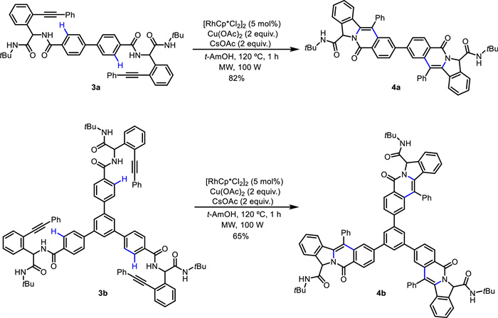 2. Synthesis of amino acids and peptides 2.1. Rhodium catalysisIn 2017, Tian and Van der Eycken developed an efficient Rh(Ⅲ)-catalyzed intramolecular annulation of alkyne-tethered benzamides for the synthesis of indolizinones and quinolizinones via C—H activation [47]. Subsequently, they employed this strategy in the modification of peptidomimetics and oligopeptides via the combination of the Ugi reaction and microwave irradiation (Scheme 2) [48]. Through C—H activation and subsequent intramolecular annulation with alkyne without installing a directing group, diversifications of peptidomimetics and oligopeptides were chemoselectively achieved, resulting in indolizinone and quinolizinone scaffolds in a rapid and step-economical manner. Diverse heteroaryl peptidomimetics involving furan, thiophene, pyrrole, benzofuran, benzothiophene, indole (2d), pyridine (2e) and thiazole, were well tolerated. α-Substituted acrylamides (2f) were compatible with this reaction, while β-substituted and α,β-disubstituted acrylamides did not work. This method could be applied to efficiently construct rosettacin (2b), oxypalmatime (2c) and camptothecin derivatives. Moreover, double and triple C—H activation/annulation were successfully performed to give the di- and trimers (4a and 4b) (Scheme 3). Additionally, this method was compatible with water and showed high chemoselectivity when adding extra N-unprotected or N-protected amino acids.