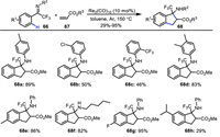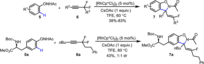 Later on, Zhou and Yi reported a redox-neutral [4 + 1] annulation of N-phenoxy amides 5 with α,α-difluoromethylene alkynes 6 via Rh(Ⅲ)-catalyzed C—H activation, leading to Z-configured monofluoroalkenyl dihydrobenzo[d]isoxazoles 7 [49]. This approach was further employed in the late-stage C—H modification of complex bioactive compounds including an amino acid (7a) (Scheme 4).