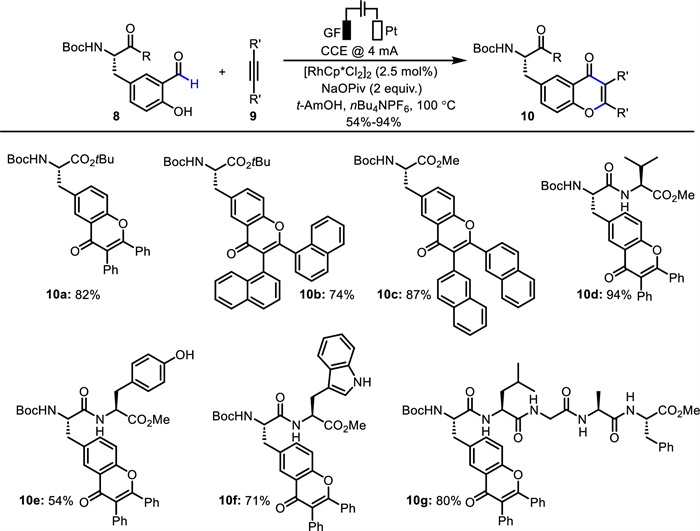 Ackermann and co-workers developed a series of elegant works employing C—H activation triggered by Ru, Mn or Co catalyst for the modification of peptides [37,50,51]. Recently, they presented a rhodaelectro-catalyzed approach to chromones via a formyl C—H activation and subsequent alkyne insertion/reductive elimination process (Scheme 5) [52]. Notably, this method could be employed for the functionalization of amino acids and peptides 8 containing a hydroxy–benzaldehyde moiety. Also, a pentapeptide was well tolerated in this reaction (10g). The obtained amino acids could undergo further photoelectrochemical oxidation to give polycyclic products with enhanced fluorescence.
