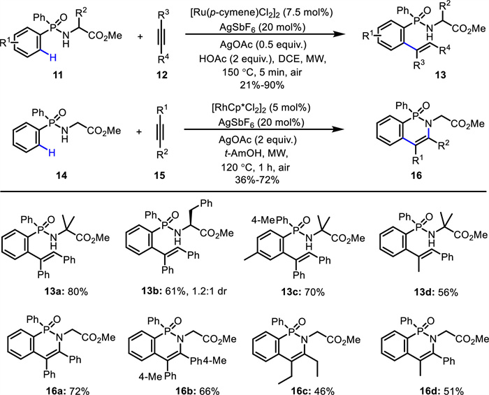 Later on, Song and Gong reported a Ru(Ⅱ)-catalyzed C—H activation of α-substituted or α,α-disubstituted glycine ester phosphinamides 11, leading to ortho-alkenylated phosphinamides 13 (Scheme 6) [53]. When a Rh(Ⅲ) catalyst was employed, ortho-C-H activation of α-unsubstituted glycine ester phosphinamide 14 and subsequent annulation with alkynes 15 occurred, resulting in various phosphaisoquinolin-1-ones 16. With the assistance of microwave irradiation, this reaction could be efficiently finished in 1 h.