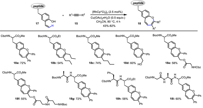 In 2022, Sakhuja and Bajaj described a Rh(Ⅲ)-catalyzed C—H activation/annulation reaction between vinylated tyrosines 17 and internal alkynes 15, leading to diverse oxepine-mounted unnatural tyrosines 18 (Scheme 7) [54]. Notably, this [5 + 2] cyclization could be employed in a series of dipeptides and tripeptides bearing a tyrosine residue (18g-18i). When amino acid/peptide-appended alkynes were used, the chemical ligation was achieved (18e and 18f).