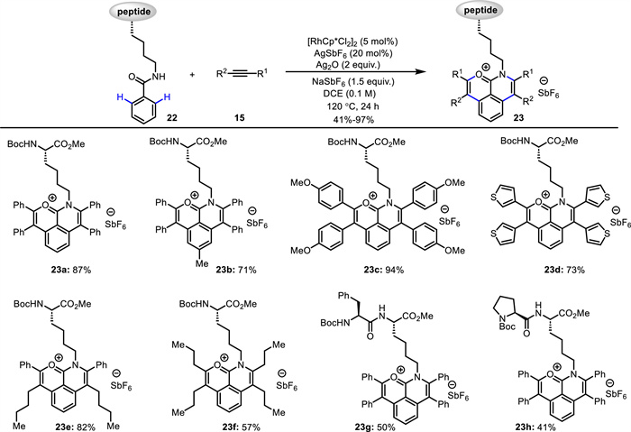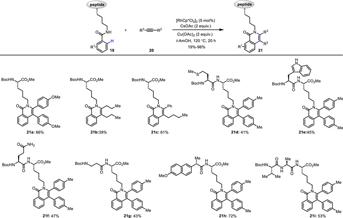 In 2023, Song, Cai and Van der Eycken developed a Rh(Ⅲ)-catalyzed C—H activation/annulation reaction for the diversification of Lys-based peptides 19 (Scheme 8) [55]. This method was performed under racemization-free conditions, owning high atom- and step-economy, and excellent chemo- and site-selectivity. This reaction featured a broad scope including peptides bearing unprotected Trp (21e) and Tyr, free Ser and Gln (21f), and Met (21d) residues, in situ resulting in an array of peptide-isoquinolone conjugates. The obtained peptide-isoquinolone conjugates exhibited maximum emission wavelength up to 460 nm. Interestingly, biological activity experiments suggested that the peptide-isoquinolone conjugates possess good antifungal activity towards crop and forest pathogenic fungi.