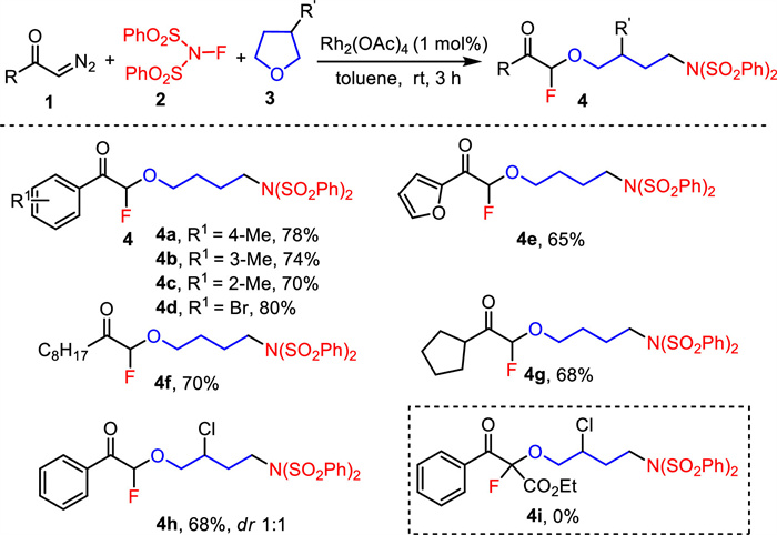 2. N–NucleophilesNitrogen-containing organic compounds such as (aza)uracils, amines and N-heterocyclic molecules are widely used in material science and drug chemistry, which have attracted considerable attention of synthetic chemists owing to their potent biological and pharmaceutical activities [55-58]. In 2016, Szabó and co-workers reported metal-catalyzed ring opening of cyclic ethers with diazo compounds and N-fluorobenzenesulfonimide (Scheme 1) [59]. This reaction is compatible with various aromatic and aliphatic α-diazoketones by using Rh2(OAc)4 as catalyst. Nevertheless, none of the desired product was observed when ethyl phenyldiazoacetate was used as substrate, which might be caused by the lower reactivity of donor−acceptor carbenoids compared to acceptor carbenoids.