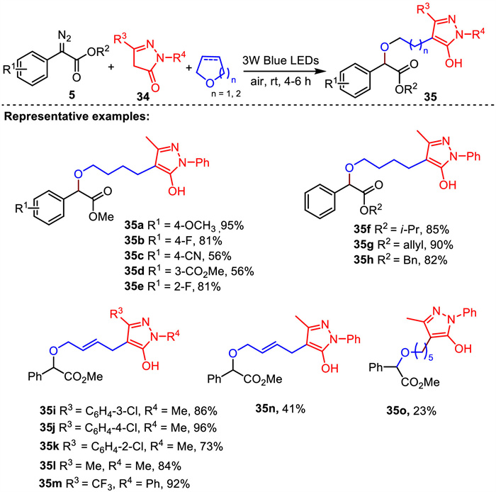 As a highly valuable nitrogen-containing heterocycles, pyrazoles frequently exist in various natural products, functional materials, and pharmaceutical molecues [67-69]. In 2022, Wei’s group reported a visible-light-promoted three-component carbene transfer reaction of α-diazoesters with cyclic ethers and pyrazolones leading to multisubstituted pyrazoles [70]. A number of multisubstituted pyrazoles could be selectively obtained through this transformation at room temperature. The representative examples for this reaction are described in Scheme 13. Various α-diazoesters including the substituents at the ester and benzene ring positions were all suitable for this reaction to provide products in moderate to good yields. Phenyl unit with ortho-, meta- or para-substituent and alkyl group on 1 and 3 positions of pyrazolone were all compatible with this reaction providing the corresponding products 35i-35m in good yields. Cyclic ethers such as 2,5-dihydrofuran and tetrahydropyran were also suitable substrates leading to the desired products 35n and 35o in relatively lower yields.