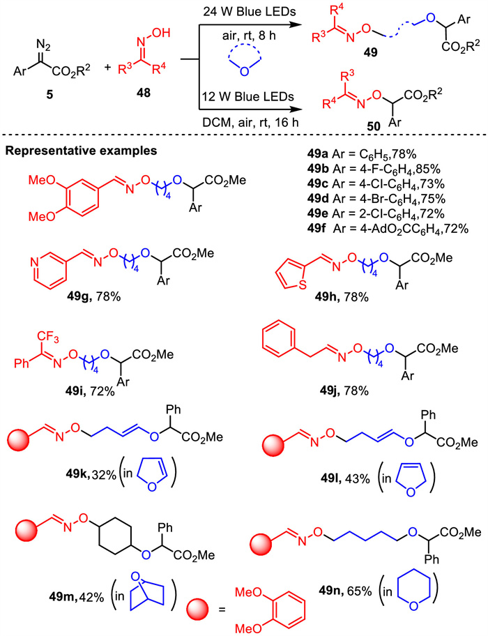 In the same year, Jurberg’s group also reported a similar visible-light-promoted three-component carbene transfer reaction of aryldiazoacetates, oximes, and cyclic ethers [77]. Meanwhile, when DCM was utilized as the solvent, visible-light-mediated O—H insertion reaction of oximes with aryldiazoacetates also underwent smoothly to afford two-component oxime ether products (Scheme 19).