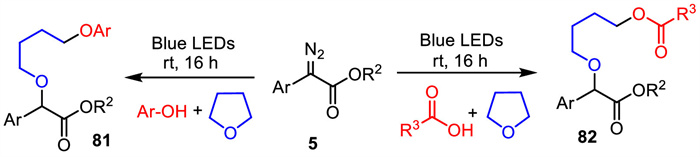 In 2022, Jurberg and co-workers also reported a blue light-induced three-component carbene transfer strategy for the synthesis of aryl ethers and esters through the ring-opening of THF using phenols and carboxylic acids as nucleophiles [54]. This photochemical reaction could be carried out under mild conditions to afford a variety of products in the absence of metals and additives (Scheme 27).