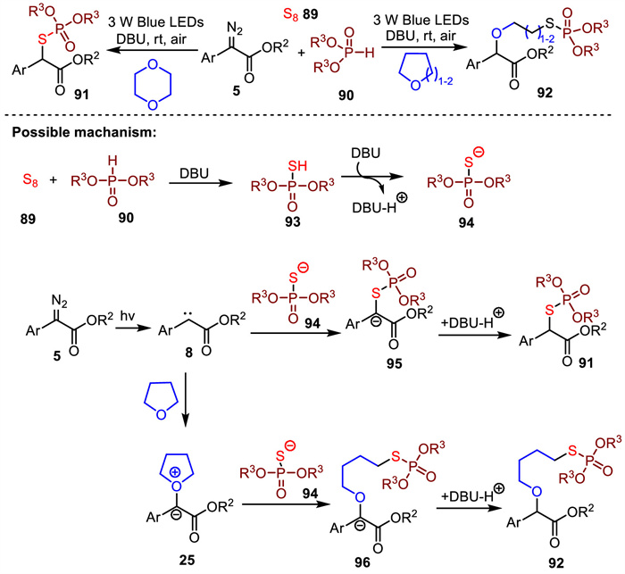 The possible reaction mechanism is proposed as shown in Scheme 32. First, the reaction between elemental sulfur 89 and H-phosphonates 90 produced phosphorothioic acid 93, which was deprotonated by DBU to form sulfur anion 94. Meanwhile, α-diazoesters generated carbene intermediate 8 with the release of N2 under visible-light irradiation. When 1,4-dioxane was used as the reaction medium, sulfur anion 94 reacted with carbene intermediate 8 to form anionic intermediate 95. The protonation of anionic intermediate 95 with DBU-H+ would lead to the formation of S-alkyl phosphorothioate 91. On the other hand, when THF was used as the solvent, carbene intermediate 8 was trapped by THF to obtain oxonium ylide intermediate 25, which was attacked by sulfur anion 94 to afford intermediate 96. Finally, intermediate 96 underwent rapid protonation to yield product 92.