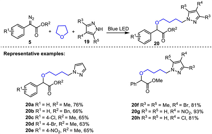 | Scheme 9. Visible-light-promoted three-component reaction of α-diazoester, tetrahydrofuran and pyrazoles. | |