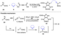 In 2023, Xuan’s group reported visible-light-promoted multi-component reaction of diazoalkanes, alkynes, and cyclic ethers to synthesize poly-substituted pyrazoles (Scheme 12) [66]. This reaction could be conducted under mild conditions using both cycloaddition reactivity and the carbene reactivity of diazoalkanes in one pot procedure. The detailed reaction pathway is presented in Scheme 12. Initially, the [3 + 2]-cycloaddition of diazoalkane 29 and alkyne 30 afforded the 1H-pyrazole-3,4,5-tricarboxylate intermediate 32. Meanwhile, the photolysis of diazoalkane generated a free carbene, which will be trapped by cyclic ether to give oxonium ylide intermediate 33. Then, the nucleophilic ring opening of oxonium ylide 33 with 32 produced the multi-substituted pyrazole 31.