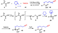 In the same year, Wei and co-workers also reported an additive-free visible-light-mediated three-component reaction of α-diazoesters with cyclic ethers and TMSCN to access structurally diverse organic nitriles (Scheme 16) [65]. This reaction was conducted at room temperature to afford organic nitriles by using TMSCN as nucleophile. It is worth noting that the resulting nitrile products could be converted to other useful compounds such as amide and phosphoramidate. A plausible reaction pathway is proposed in Scheme 16. Initially, carbene intermediate 8 was generated from α-diazoester under visible-light irradiation. Subsequently, the carbene intermediate 8 was trapped by ether to form the oxonium ylide intermediate 25. Then, the nucleophilic addition of TMSCN 41 to oxonium ylide intermediate 25 gave intermediate 43. Finally, the protonation of intermediate 43 by water produced the corresponding product 42.
