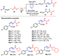 As shown in Scheme 17, a variety of α-diazoesters were suitable for this four-component carbene transfer reaction generating the expected products 46a-46g in moderate to good yields. A series of amines including secondary amines (cyclic or acyclic) and aliphatic primary amines were also compatible with this procedure to obtain the desired products 46h-46o in 63%−85% yields. Notably, polycyclic amine was also a suitable substrate, and the corresponding product 46p could be obtained in 53% yield, showing the possible application of this strategy in drug discovery.