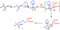 The possible mechanism is demonstrated as shown in Scheme 3. First, aryl diazoacetate 5 was irradiated by visible light to generate the carbene intermediate 8, which was trapped by 1,4-dioxane to gain the oxonium ylide intermediate 9. Then, NFSI 2 underwent fluorination reaction with the oxonium ylide intermediate to yield 11. Finally, the nucleophilic addition of benzenesulfonimide negative ion to oxonium ylide intermediategave the desired product 7.