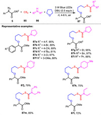 In 2022, He's group reported a facile visible-light-induced strategy for the synthesis of N,S-dialkyl dithiocarbamates through multi-component reaction of α-diazoesters, amines, CS2 and tetrahydrofuran [97]. This transformation could rapidly and efficiently obtain various structurally diverse four-component coupling products with the assembly of the ring-opening of THF by simply using DBU as the additive (Scheme 30). The reaction exhibited a broad substrate scope at room temperature. α-Diazoesters with diverse substituents, including electron-deficient or electron-rich groups at varying positions on the phenyl moiety, reacted rapidly to afford the diverse N,S-dialkyl dithiocarbamates 87a-87f in excellent yields. α-Diazoesters with different ester groups such as ethyl, benzyl and isopropyl groups were all suitable substrates, generating the corresponding products 87g-87i in good yields. The scope of amines was also investigated. Apart from pyrrolidine, cyclic amines such as morpholine and 4-methylpiperidine were compatible with the reaction, delivering the desired products 87j and 87k in 79% and 75% yields. In addition, acyclic secondary amines such as dimethylamine and dibenzylamine also participated reaction effectively, affording the corresponding products 87l and 87m in 72% and 85% yields.