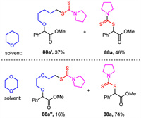 Other cyclic ethers such as tetrahydropyran and 1,4-dioxane were also examined in this reaction system. As shown in Scheme 31, when tetrahydropyran was used as the solvent, the reaction afforded the mixture of three-component dithiocarbamate 88a and four-component product 88a’ with the ring-opening of tetrahydropyran. When 1,4-dioxane was employed as the solvent, three-component dithiocarbamate 88a was obtained as main product and four-component product dithiocarbamate 88a’’ was isolated with a low yield.
