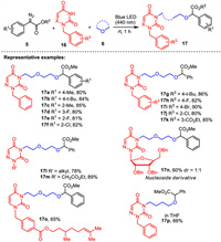 In 2023, Murarka's group described a visible-light-induced three-component imide alkylation of aryl diazoesters, azauracils andcyclic ethers leading to substituted imide products [62]. This alkylation reaction proceeded under mild conditions without requiring any catalyst or additives. Aryl diazoesters with electron-rich or electron-deficient substituents at the para-, meta- or ortho-positions of the phenyl ring provided the desired products 17a-17f in 80%−85% yields. Additionally, various azauracils bearing electronically and structurally varied N2-substituents afforded the corresponding products 17g-17m in 80%−90% yields. Pleasingly, azauridine and uracils were also suitable for this method, providing the desired products 17n and 17o in 60% and 65% yields, respectively. It should be noted that other cyclic ether such as tetrahydrofuran was tolerated in this procedure to afford the desired product 17p in 88% yield (Scheme 7).