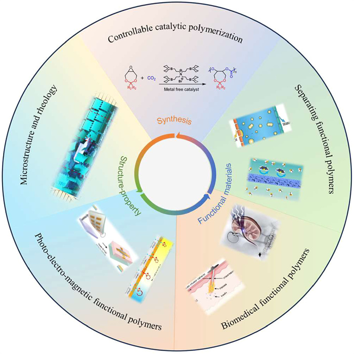 In conclusion, this review has highlighted the breadth and depth of research advances made by the MOE Key Laboratory of Macromolecular Synthesis and Functionalization during 2024, showcasing significant progress across its five core research areas. In controllable catalytic polymerization, innovative organoboron catalysts have achieved >99% selectivity for alternating PPC, while CO2-PCs are emerging as high-performance developed photoresists. This achievement paves the way for greater control over polymer synthesis as well as bridging polymer chemistry with semiconductor manufacturing. The efforts in microstructure and rheology have elucidated deformation mechanisms in graphene-based 2D membranes, leading to superhigh modulus and excellent thermal conductivity in graphene with topological cellular structures. These findings provide a foundation for future efforts focused on translating these findings into scalable fabrication techniques for high-performance graphene materials, controlling the assembly/orientation of graphene sheets to optimize properties across diverse applications. Regarding separating functional polymers, novel Janus membranes and channels, refined techniques for organic solvent nanofiltration, and HABD models have offered excellent results, providing a platform for prioritizing the design of adaptive membranes responding to changing conditions and developing advanced separating membranes for concentration polarization issues and precise molecular separations. In the domain of biomedical functional polymers, studies explored the upcycling of PET waste to biodegradable PEHT plastics, creation of immunocompatible surfaces, and treatment of fungal infections via induced fungal cuproptosis. Success was also achieved in fast hemostatic sealing using GDK/Fg hydrogels, promoting endothelialization of LAA occluders by introducing double-network polyelectrolyte hydrogels, and designing deep-tissue activation for shape-memory polymers. These studies offer a compelling trajectory for continued development, emphasizing the translation of these materials into clinically relevant medical devices, enhancing biocompatibility, and integrating diverse functionalities. Finally, control of through-space conjugation enhanced organic luminescence, topologically structured hydrogels demonstrated autonomous performance, photothermal ion pump successfully transported ions, high-performance C60 single crystals was manufactured for electronics and extraordinary dielectric properties of PE PLSCs was demonstrated, illustrating the broad potential of polymer materials with rationally designed structures across fields as varied as electronics, photonics, and energy. These advances, ranging from polymer synthesis to investigations of structure-property relationships and the development of advanced functional materials, are expected to stimulate significant research in both fundamental science and practical industrial applications.