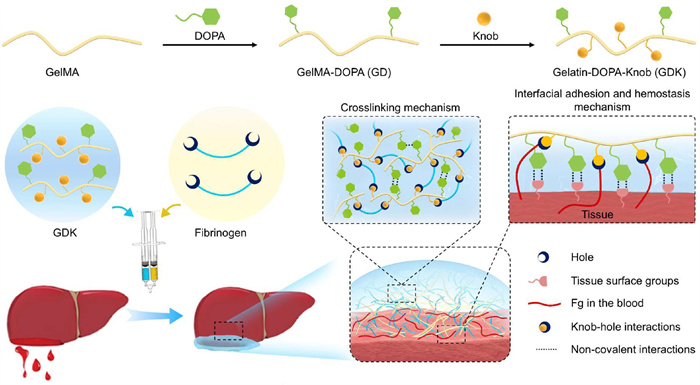 Herein, drawing inspiration from the mechanisms of fibrin polymerization and mussel adhesion, a gelatin-DOPA-knob/fibrinogen (GDK/Fg) hydrogel is designed for rapid and robust hemostatic sealing (Fig. 10) [88]. The strategy involves using knob peptide and catechol groups to modify gelatin (GDK), which enables crosslinking with fibrinogen (Fg) through knob-hole interactions. Additionally, the cohesion of the hydrogel is enhanced through non-covalent interactions between the catechol groups. This crosslinking mechanism facilitates the rapid formation of the hydrogel and provides a robust physical barrier. When applied to hemostasis, the GDK/Fg hydrogel interacts with tissue surface through catechol groups, achieving firm adhesion and effectively sealing the wound. Additionally, the knobs in the GDK/Fg hydrogel can bind to Fg in the blood-covered tissue surface via knob-hole interactions, accelerating the coagulation cascade and forming a tight fibrin gel layer on the tissue surface, thereby enhancing interfacial adhesion. Compared with commercial fibrin glue, GDK/Fg hydrogel shows similar gelation time and biocompatibility, as well as stronger adhesive properties and storage stability. This hydrogel exhibits excellent hemostatic sealing effects in both rat severe liver injury and heart puncture injury. The results show that GDK/Fg is a safe and effective hemostatic adhesive with significant prospect in medical settings.