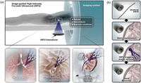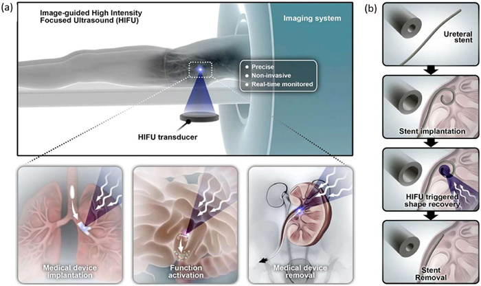 | Fig. 12. (a) Equipment layout of image-guided high-intensity focused ultrasound (HIFU). Image-guided HIFU facilitates precise, non-invasive, and real-time monitored heating of shape memory medical devices in vivo. This technology has potential applications in medical device implantation, functional activation, including drug release, and device extraction. (b) Concept of shape memory ureteral stent removal. Copied with permission [103]. Licensed under CC-BY. | |
