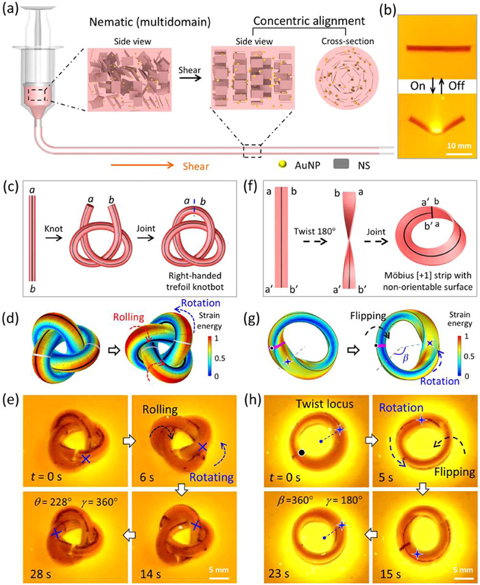 | Fig. 14. (a) Schematic for the fabrication of anisotropic hydrogel with shear-induced alignment of nanosheets. (b) Photothermal bending of the anisotropic gel upon light stimulus. (c) Schematic for the fabrication of the right-handed trefoil knotbot. (d) Simulated strain energy of the knotbot under static light irradiation. (e) Autonomous rolling and braid rotation of the trefoil knotbot under constant light irradiation. θ and γ represent the rotation and rolling angles, respectively. Reproduced with permission [130]. Licensed under CC-BY. (f) Schematic for the fabrication of the Möbius strip robot. (g) Simulated strain energy of the Möbius strip under static light irradiation. (h) Autonomous rolling and braid rotation of the Möbius strip robot under constant light irradiation. β and γ represent the rotation and flipping angles, respectively. Reproduced with permission [131]. Copyright 2024, Wiley Publishing Group. | |