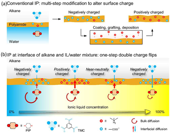 | Fig. 15. (a) Schematic illustration of negatively charged polyamide membranes fabricated by conventional interfacial polymerization at the alkane-water interface. (b) Schematic illustration of double charge flips of polyamide membranes by ionic liquid-decoupled bulk/interfacial diffusion during interfacial polymerization. Copied with permission [140]. Licensed under CC-BY. | |